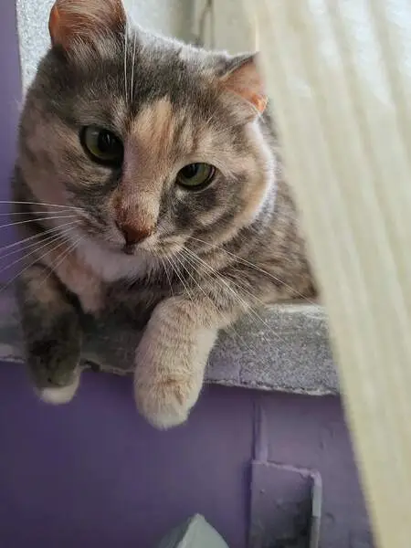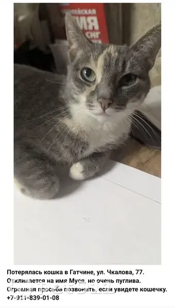 Серенькая, пятна белые и рыжеватые. Гладкошерстная. Глаза очень выразительные. Вышла на улицу утром 9 сентября и пропала. Пуглива, не подходит к чужим людям. Откликается на кличку Муся.