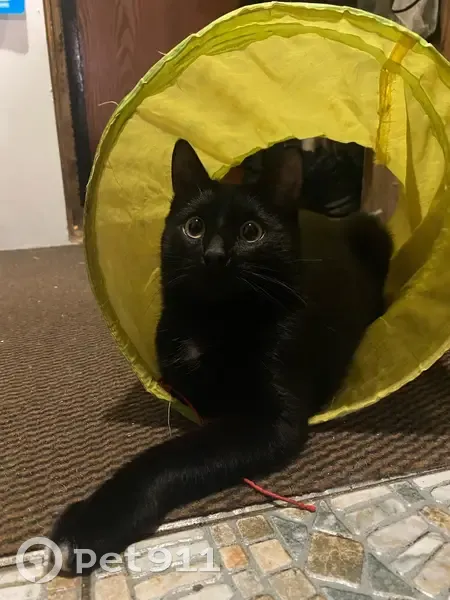 Черный ,гладкошерстный,молодой годовалый кот с белым пятнышком на груди и передних лапках.Ушел гулять и не вернулся