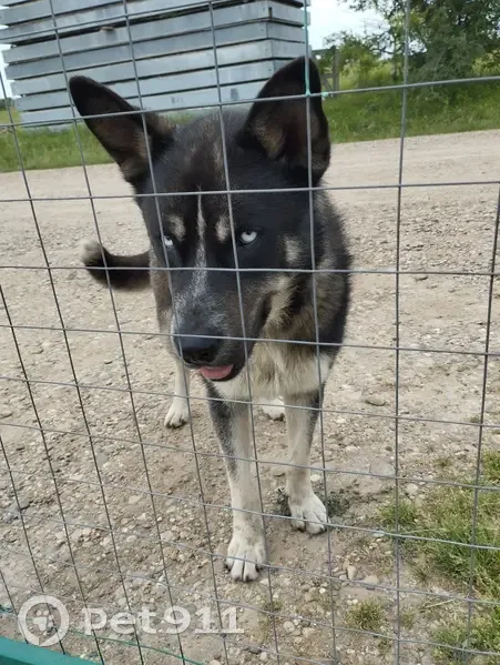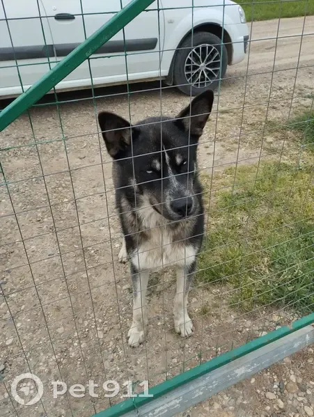Собака домашняя, добрая, чистая, ухоженная, есть след ошейника, в первый день ошейник был, сегодня четвертый день и ошейника нет. Красавец, похожа на хаски, светло голубые глаза.