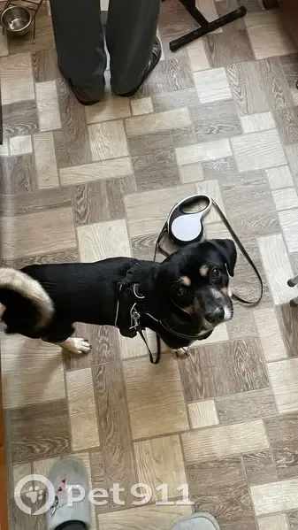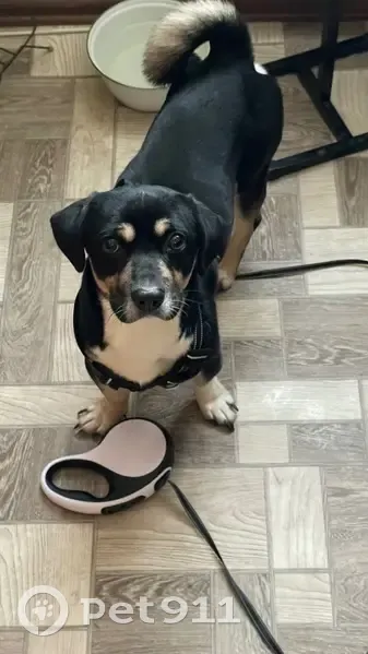 Найден на улице Зелёная . Шлейка чёрного цвета, рулетка белого цвета с подсветкой. Дворняга небольшого размера. Цвет основной черный с белой грудкой, коричневыми бровями. На шее белое пятно. Когти длинные. Пёс не обученный, проявляет агрессию, недоверчивый. У себя оставить не можем, своих 2 собаки, на них он рычит.