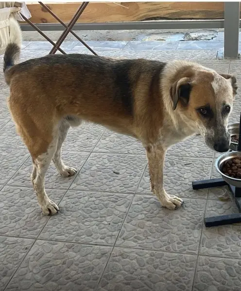 Оранжевые глаза,белые лапы, очень уставший(при находке уснул),мальчик, коричнево-красный ошейник,чёрная спина, часто находится в пятёрочке на ул.Шмидта.Нашли на остановке.