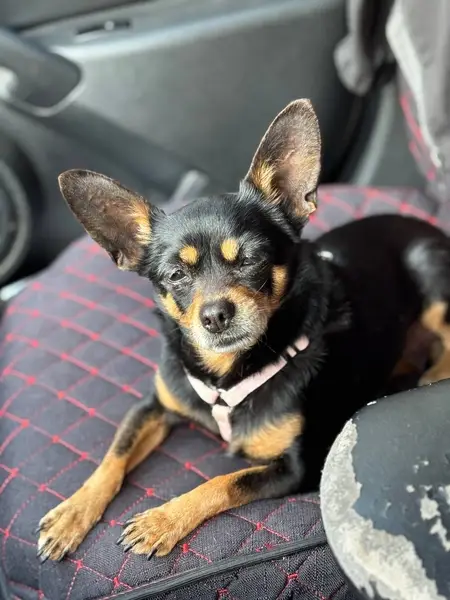 Тойтерьер, чёрный, с коричнево-белой мордой, с розовым ошейником от блох. Мальчик.
