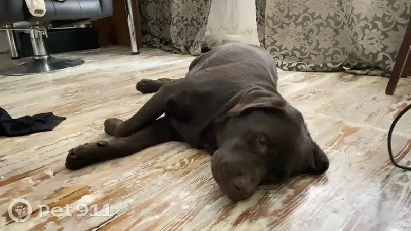 Лабрадор ретривер,шоколадного окраса,без ошейника,ухоженна,возможно беременна. Подходила к людям,дружелюбная,спокойно ведет себя дома,бродит недавно,пару дней. Пришла из с. Краснокумского по словам очевидцев.
