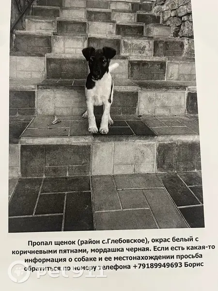Очень симпатичный ,щенок фокстерьера которому 4- месяца мордочка черная сам белый с коричневыми пятнами на спине , хвост купирован . Он выбежал на улицу из под калитки, и видели его многие по поселку он бегал с большими собаками, но мне рассказали, девочки школьницы, которые играли с ним, что к ним подходили два дяди , и спросили чей щенок, на что девочки ответили, что не знают , тогда эти дяди сажают щенка в машину увозят его , сказав девочкам , что повезут его в « хорошие руки « очень надеюсь, что щенок найдётся.