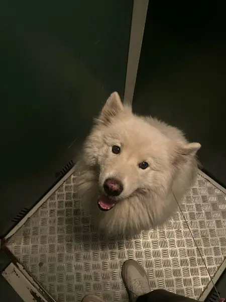 вроде порода самоед, с ошейником, ходит по кругу на привокзальной площади Голицыно