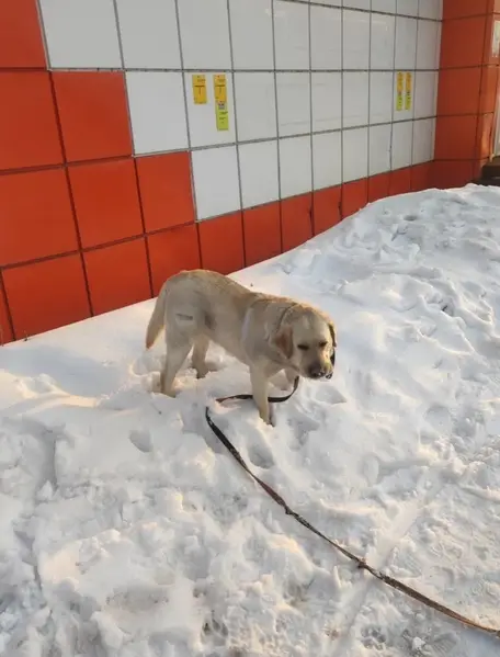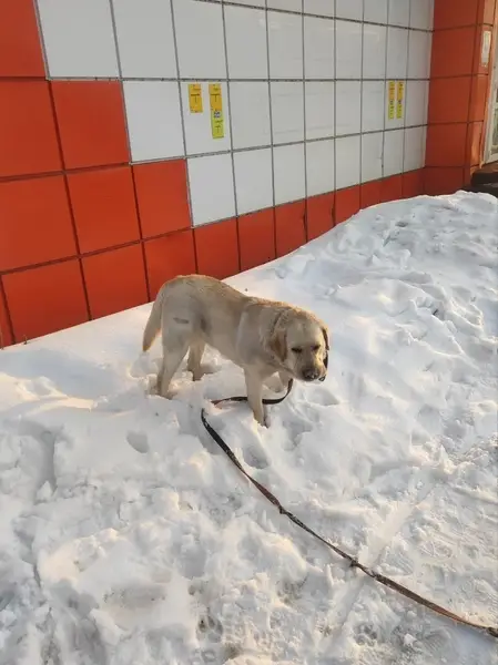 Лабрадор. Окрас светло-желтый. Есть ошейник. Приучена к машине. Знает команды.