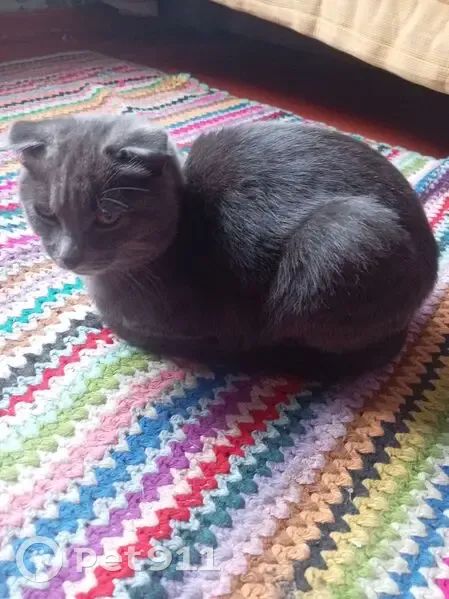 Серая вислоухая кошечка с жёлтыми глазами. Лю...
