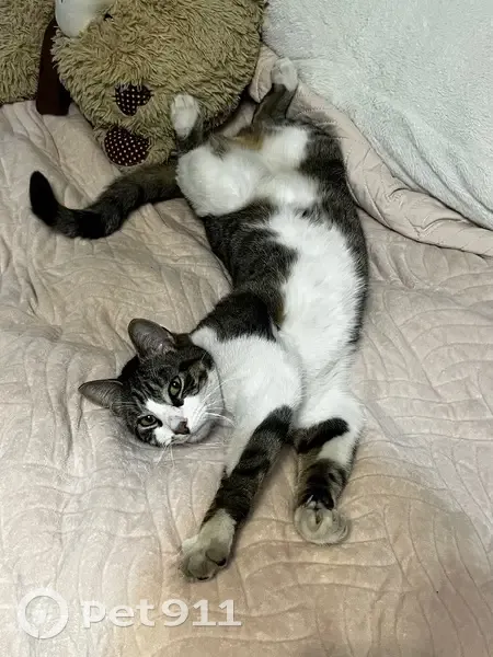 Полосатый окрас, белая шерсть на пузике и на лапках. Ушел без ошейника. У него немного вытянутое тельце. С нами был всегда ласков, обычно к чужим не подходил