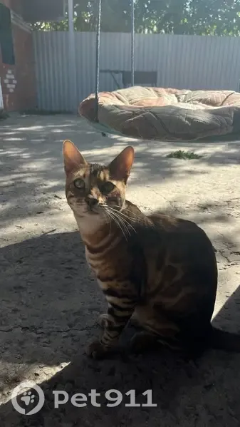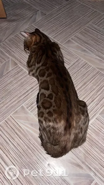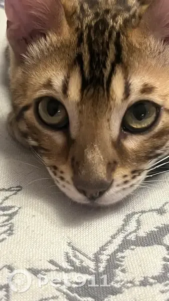 Бенгальская порода , окрас п 24 (розетка на золоте) , 27 вечером вышел на прогулку и не вернулся. Его мауканье больше похоже на детские звуки, требовательный и характерный, в руки не даётся.