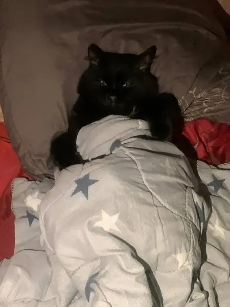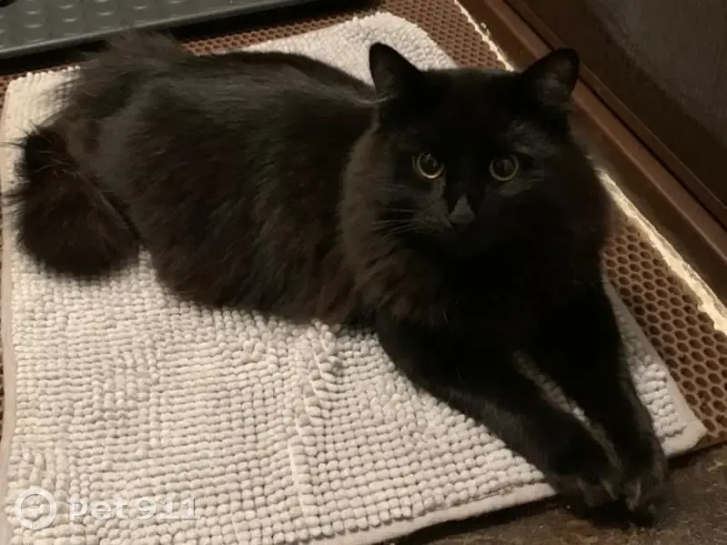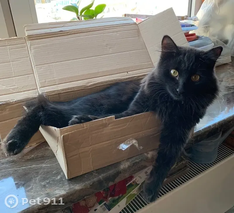 Кот черного окраса, крупный, на пузе белое пятно в виде сердечка. Пушистый. В некоторых местах подстрижет ( от колтунов). Шерсть с единичными белыми волосками. Добрый, ласковый, умный кот.Отзывается на кличку. Зрачки рыжие.