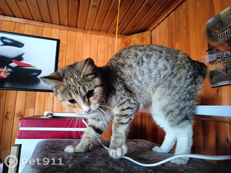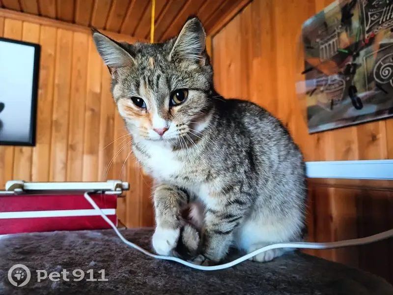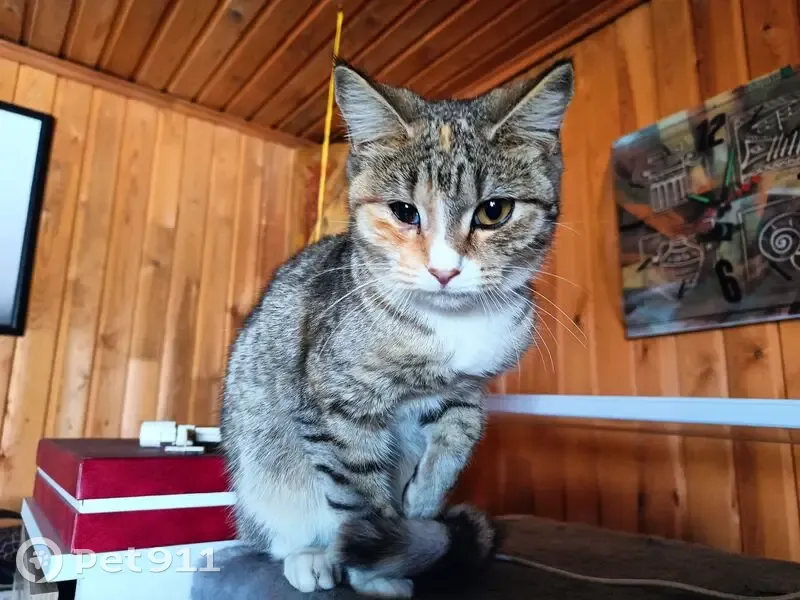 Котёнок, не больше 3-х месяцев на вид, окрас азиатская табби, трёхцветная. Повредила третье веко на правом глазике. Лапки белые, конец хвостика - тоже. Рыжее пятнышко на макушке.