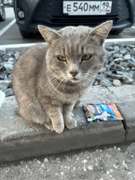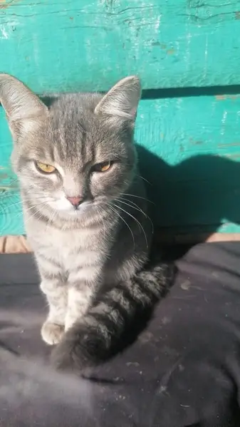 Полосатый серый котенок, с желтозелеными глазами. На нем ошейник фиолетовый с жетоном космической тарелки. Котенок откликается на кличку, но может игнорировать чужих. Ласковый, но пугливый. Возраст 5 месяцев. Котенок находится на спецпитании связи с аллергией.