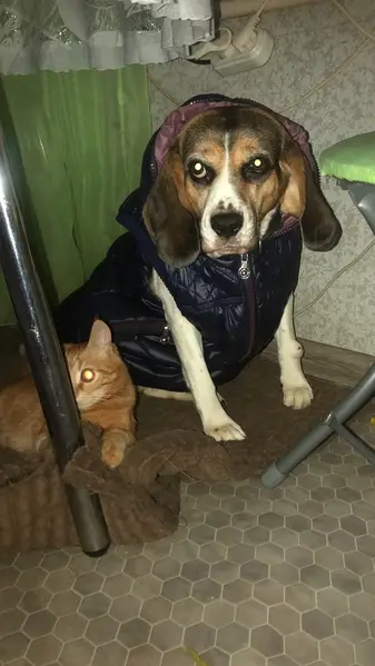 Средних размеров, похожа на породу бигль. Девочка. На ошейнике информации нет. Ласковая, контактная. Скорее всего жила в квартире. Собака была обнаружена в подъезде в четверг (6 февраля).
