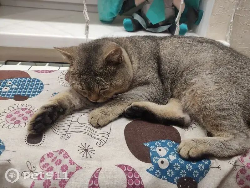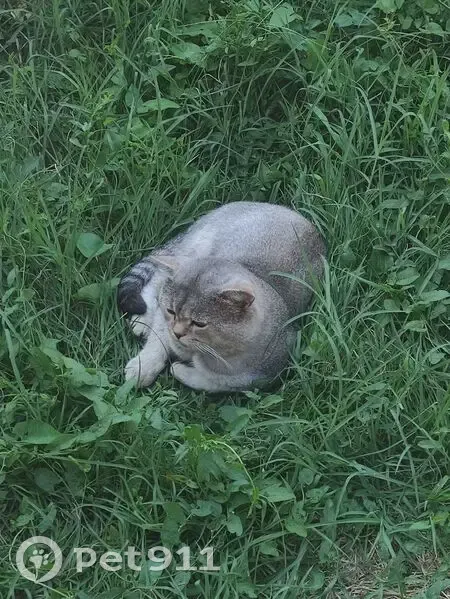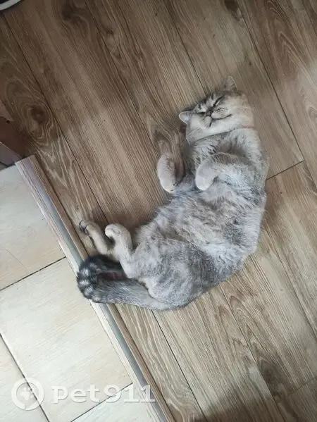 Плоская мордочка, выражающая серьëзность или недовольство, чëрные подошвы на лапках, шерсть серо-бронзовая. Был без ошейника.