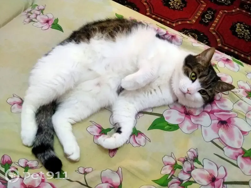 Очень крупный и ласковый, людей обычно не боится. Серая спина, белый живот, полосатый хвост (более темные полоски на сером фоне), серое пятно на передней левой лапке. Фиолетовый ошейник от блох. Уже в возрасте - 13 лет, но бегает быстро.