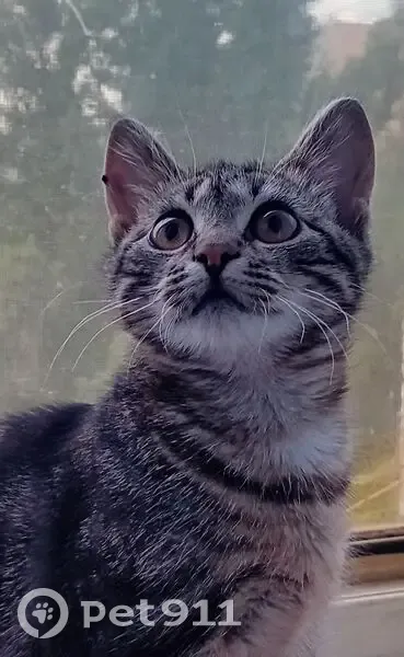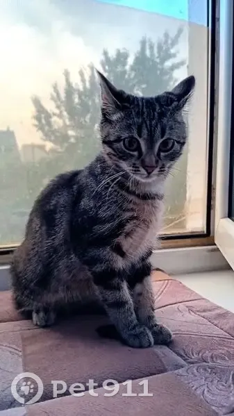 Серый , с черными мраморными пятнами , короткошерстная , карие глаза, на правом ушке шрамик от травмы ..Возраст 3 месяца , к людям недоверчива . Сбежала при переезде на новое место жительства .