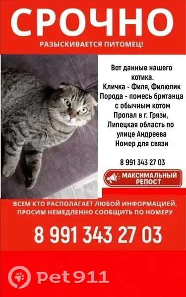 Отзывается на Филю, Филюлик. Ушки вислоухие, он помесь британца с обычным котом.Пропал в Грязях, на улице Андреева. Вознаграждение за нахождение кота 10 000 рублей.