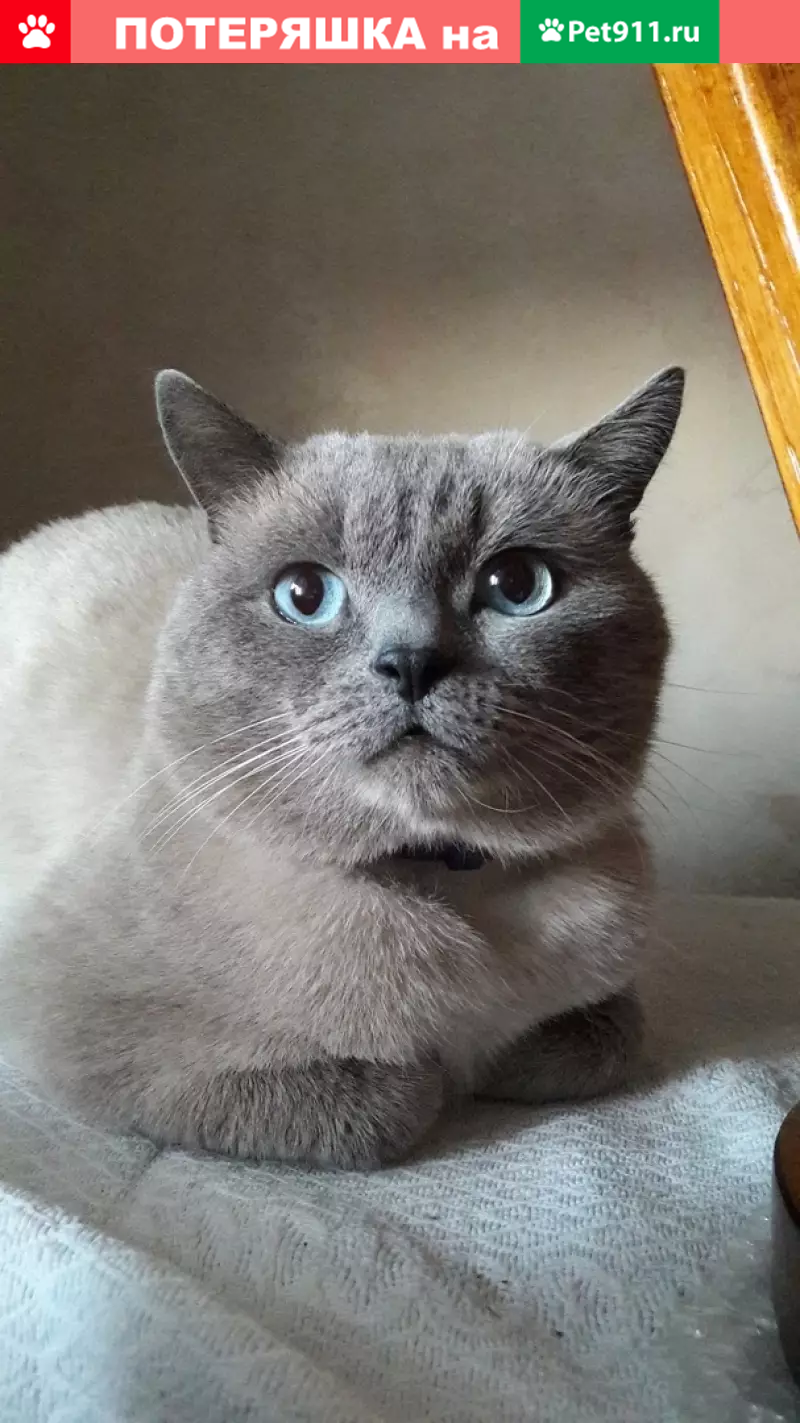 Окрас блю-поинт, глаза голубые. Откликается на кличку Басик. Убежал после драки с другим котом. Может быть ранен. На шее был сиреневый ошейник.