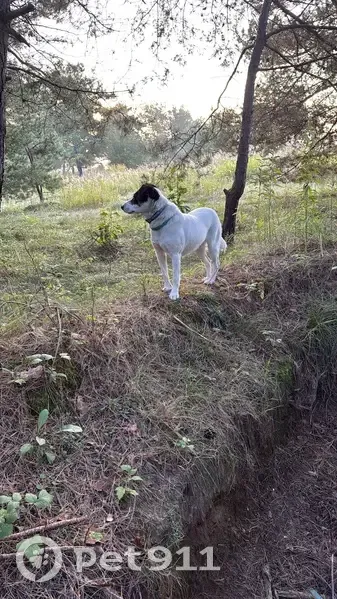 Белая с черными пятнами, два ошейника: голубой и зеленый от клещей. Пропала в лесочке возле воинской части, начались стрельбы, наверное испугалась. Очень умная собака.