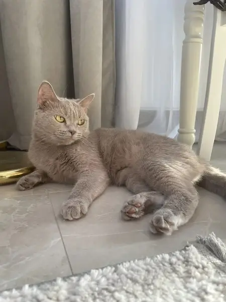 Кот, порода британская короткошерстная, прямоухая (вероятно). Возраст - около 4 лет. Не кастрированный. Окрас - серый, глаза желтые.