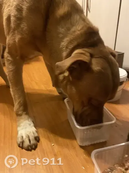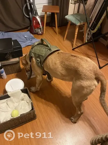 Рыжий. В шлейке без адресника. На спине есть полоса шерсти растущая в обратном направлении. Не кастрирован. Явно домашний. Знает команды. Не агрессивный