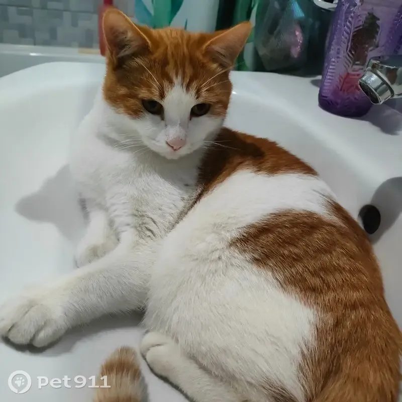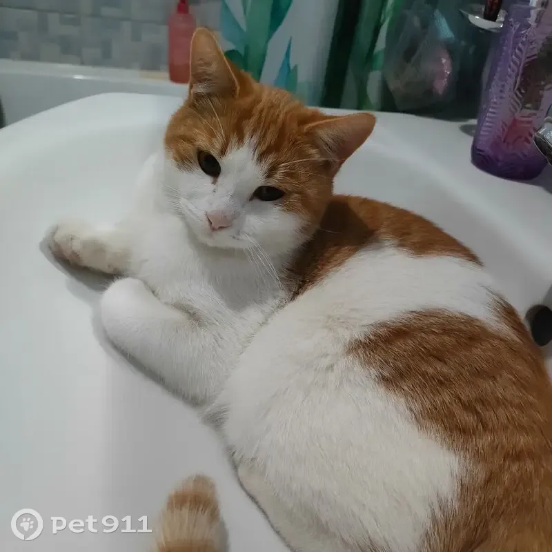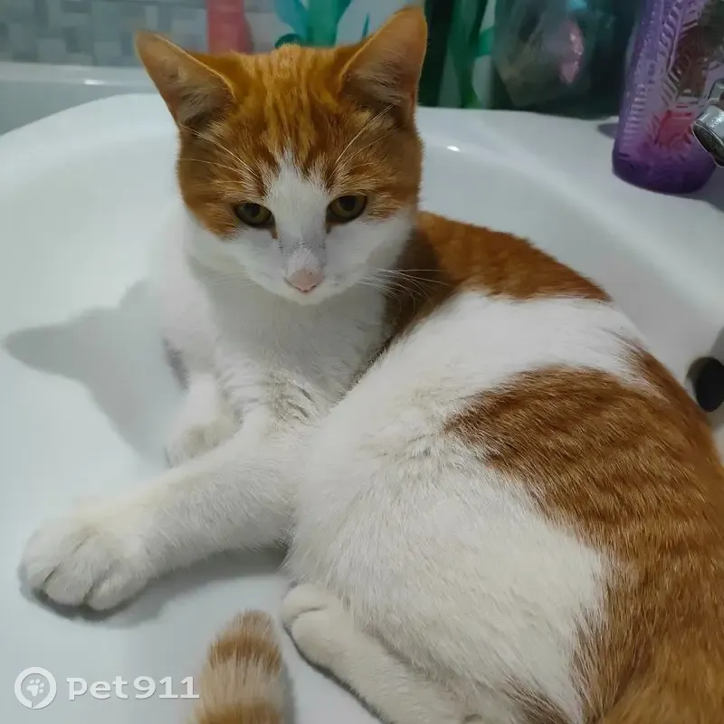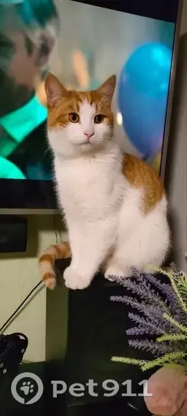 Вышел днём 26 декабря погулять во дворе и не вернулся. Окрас белый и яркими рыжими пятнами в полоску, хвост полосатый, нос розовый, котёнок довольно крупный. Глаза жёлтые, под цвет шерсти
