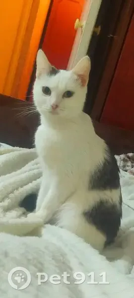 Серо-белая. Спокойная, но очень пугливая по отношению к незнакомым людям. Убежала и квартиры, и из подъезда, пока дверь была чуть приоткрыта.