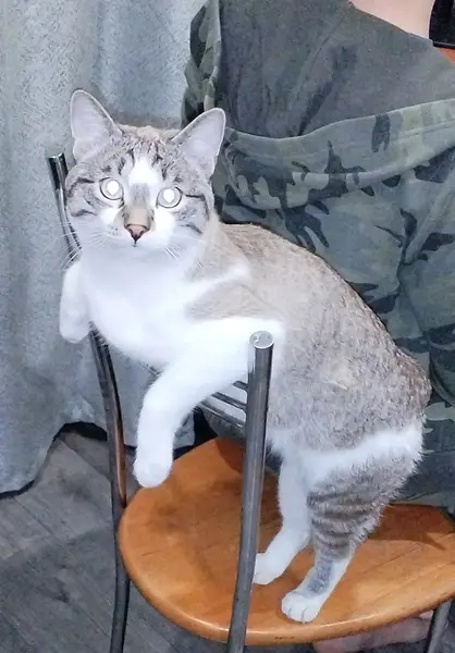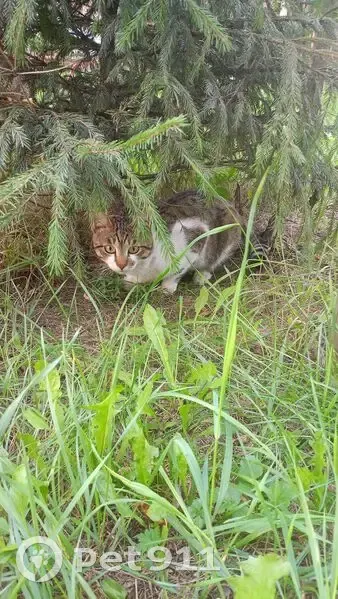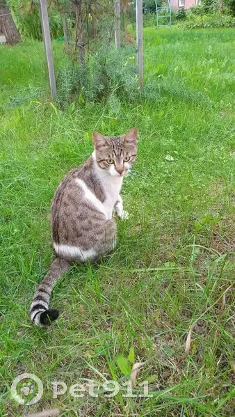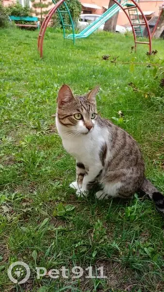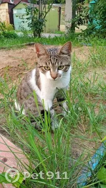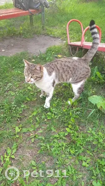 Во дворе найден кот, молодой, очень контактный, игривый, с детьми ладит, серо-белый окрас, кончик хвоста в полоску, глаза зелёные, любит бегать и лазить по деревьям