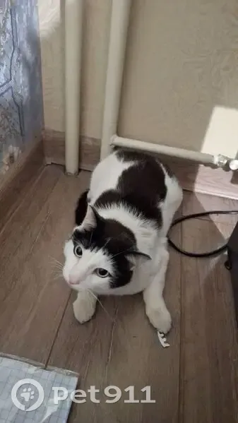 Найден кот, мальчик, беспородный, белый с чёрными пятнами, короткошёрстный 12 сентября в 21:00. Кот явно домашний, сам идет на контакт. Ищу хозяина для нее, пока у меня на передержке.