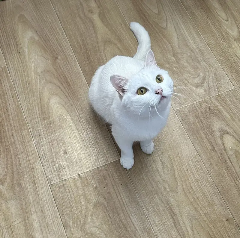 Шерстка белая, удлинённая. Кот стоял на прямых ногах вжавшись в побеленную стенку мусорки с расширенными от страха глазами. Шерсть, нос и уши чистые, подушечки розовые, успел лапки на половину замарать.