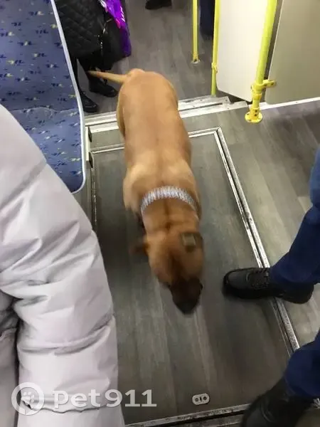 Дата 08.10.25 (не ставилась почему-то сегодняшняя дата). На трилиссера собака зашла в трамвай, время 7.37 собака ещё едет в трамвае 191, номер 3. На ней ошейник, девочка. Видно что потерялась.