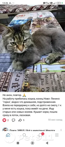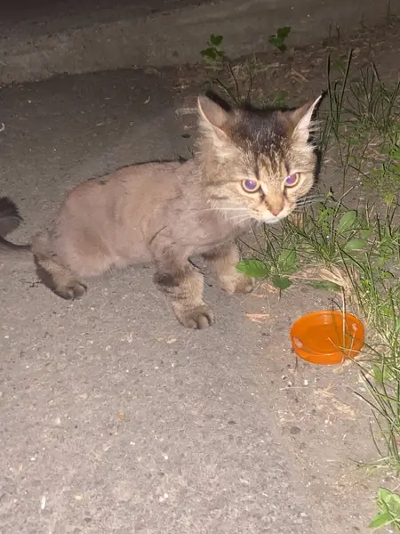 коричневый окрас с черными пятнышками. Выбрито все, кроме головы, кончиков лапок и кончика хвоста. Отзывается на «кис кис» только ночью, очень ласковая.