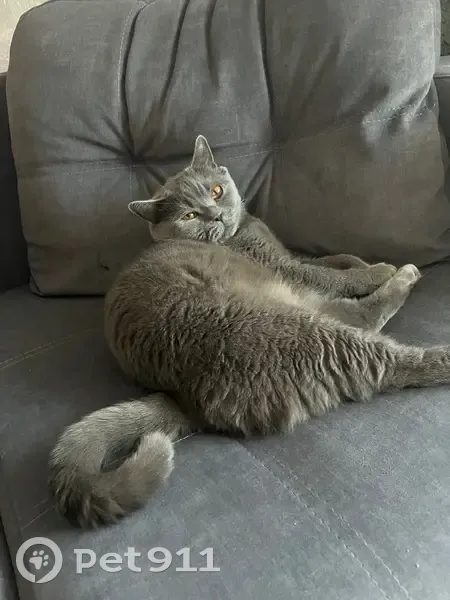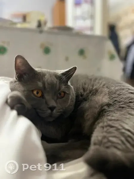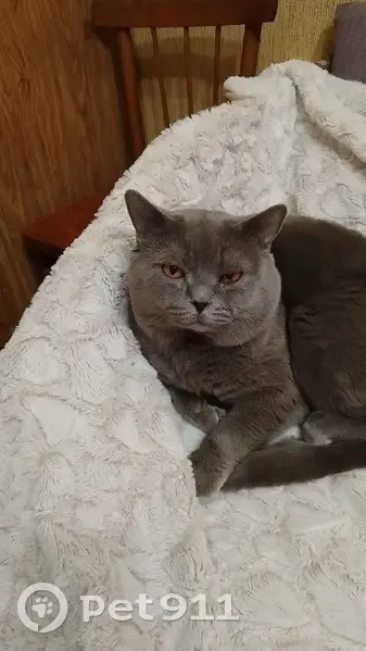 Серый цвет, котик пухлый, порода британец. Возраст 6-7 лет. На радужке глаза шрамик. Глаза ярко желто-ораньжевого цвета