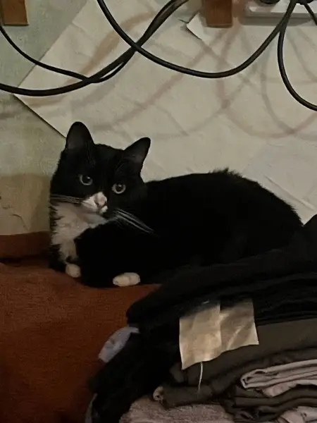 Черный кот с розовым носом. Белые носочки на лапках, белая грудка, живот, морда. На розовом носу есть черное пятно сбоку, подушечки лап розовые, на левой передней лапе черное пятно на подушечке. Убежал с крыльца дома, не успела поймать его
