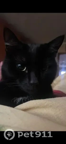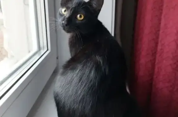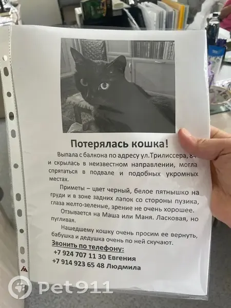 Черная кошка, на груди белое пятнышко, в ушах есть белые волоски и белые волоски на пузике, между задних лапок, Глаза желто-зеленые, стерилизованная. Отзывается на Маню, ласковая, но пугливая.