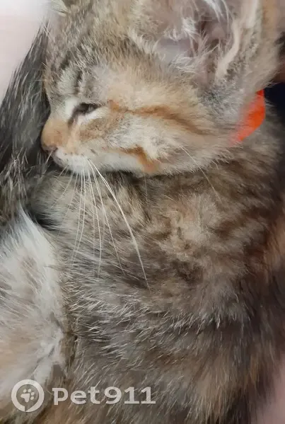Девочка, чёрно-рыжая, ласковая, с красным ошейником от блох, месяца 3-4, точно не знаем, нашли так: девочка шла с остановки Тюменская улица, и пошла в конец улицы, увидела котёнка и погладила, потом пошла до дома, котёнок пошёл за ней, но она этого не увидела, и она дошла с ней до дома.