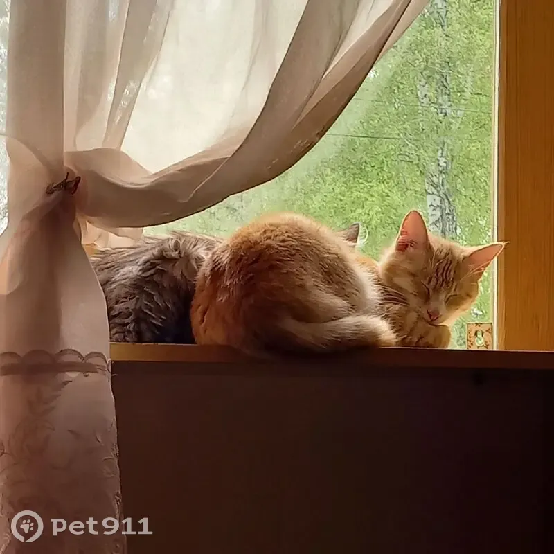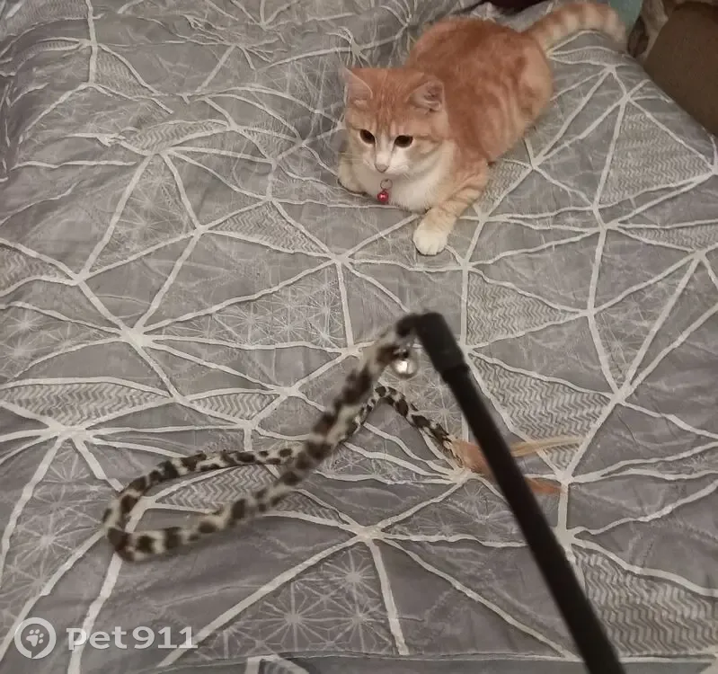 Рыжий полосатый молодой котик с белым подбородком, горлом, пузиком и носочками, на шее ошейник кораллового (розово-оранжевого) цвета с узором лап, но без колокольчика