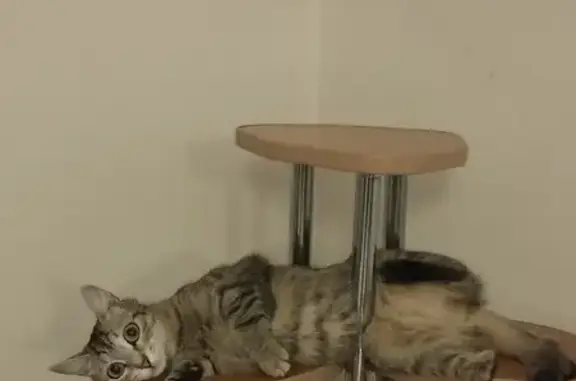 Кошечка, примерно 6-7 мес. Пятнистые подушечки, грудка белая, полоски на лапках и на теле. Найдена в НСО Искитим, Подгорный. Сначала боялась, шугалась. Взяла домой, отошла, ведëт себя спокойно.