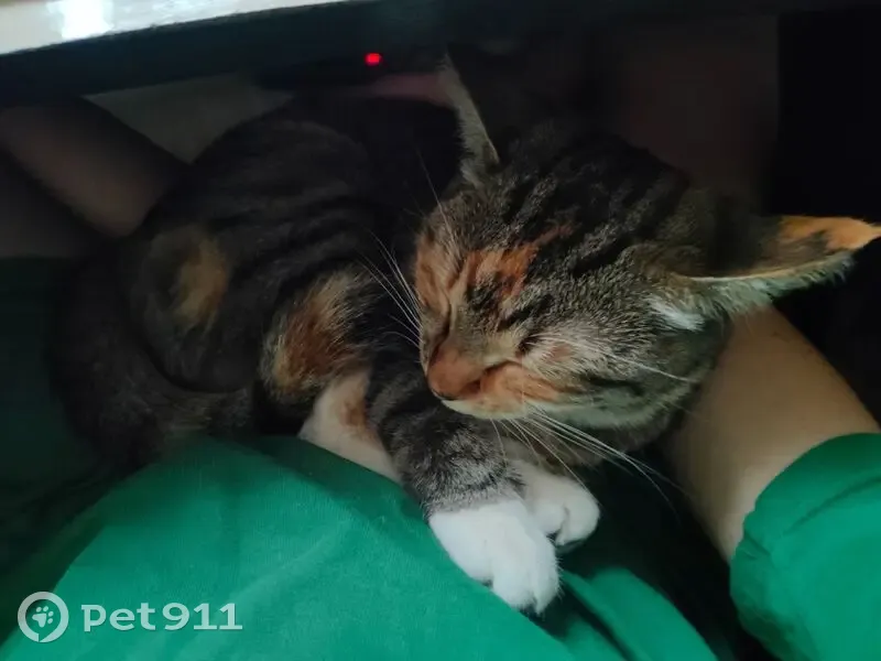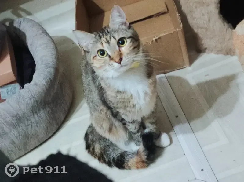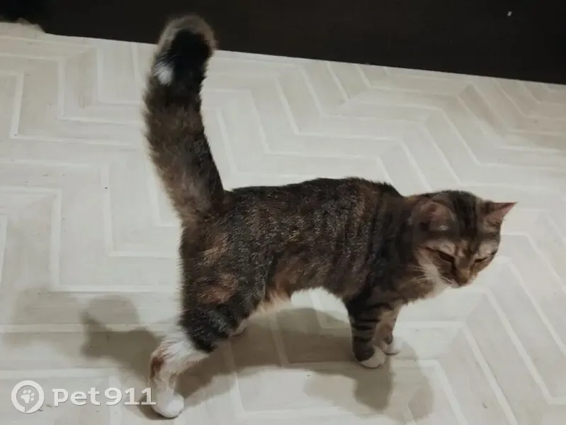 Черепаший окрас, беспородная, на кончиках ушей мини-кисточки, на самом кончике хвоста белое пятнышко, на передних лапах белые носочки, на задних белые гольфики, нос розовый, подушечки лап розово-черные пятнами