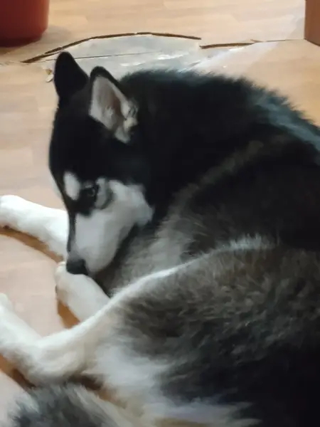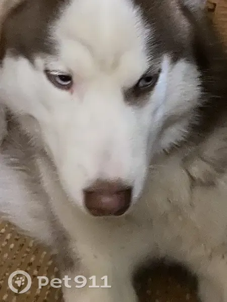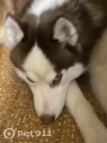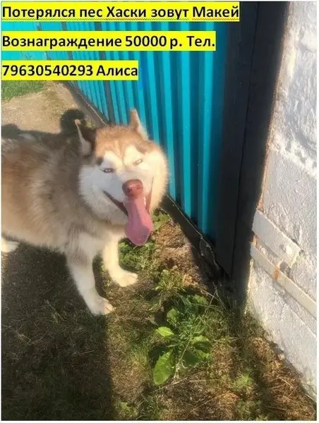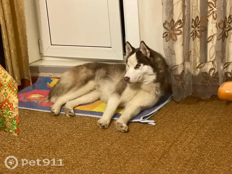 Хаски. Окрас коричневый с белым . Не любит гулять на поводке. Смышленый , активный , красивый голубоглазый , знает базовые команды . Сухой корм не кушает , предпочитает кашу с мясом . Гулял один , привели домой , чтоб он мог дождаться своего хозяина . Сейчас находится под присмотром пожилой дамы .