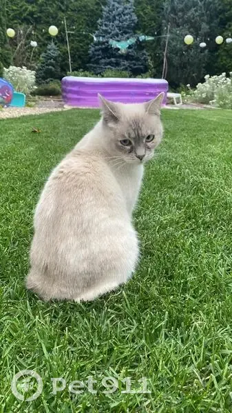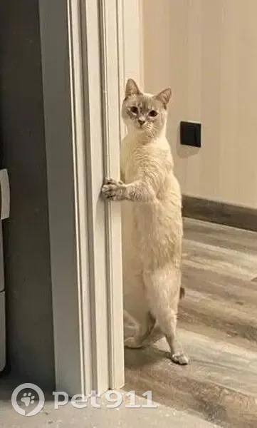 Возраст 4 года, стерилизованная. Серо-белый окрас, на одной лапке розовые подушечки, на остальных черные, хвост полосатый, с горбинкой, глаза серо-голубые, нос розовый.Откликается на БУЛЯ, БУЛЬОНА, БУЛЬОШКА.