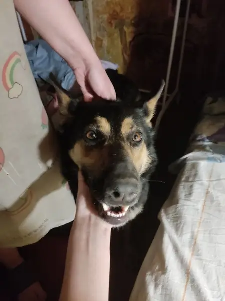 Среднего роста, черная с желтыми подпалинами, одно ухо стоит, другое висит, на ней ошейник с моим номером. Общительная, не агрессивная.