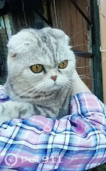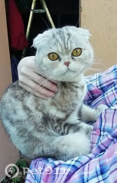 Найдена кошка 31.08.25 г.! Район Ленинский путь, Минские (ул. 3-я Петрозаводская, 16, у магазина Малинки). Порода шотландская вислоухая. Возраст приблизительно 5 лет. Сидела под крыльцом. Думали, может с балкона упала