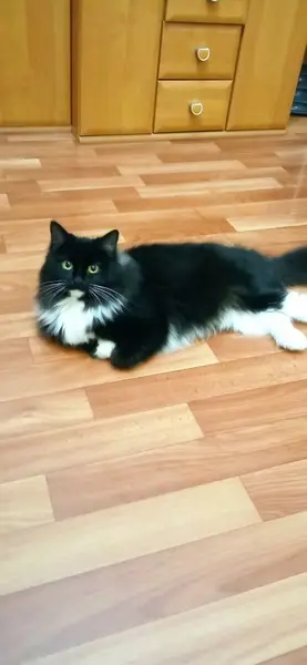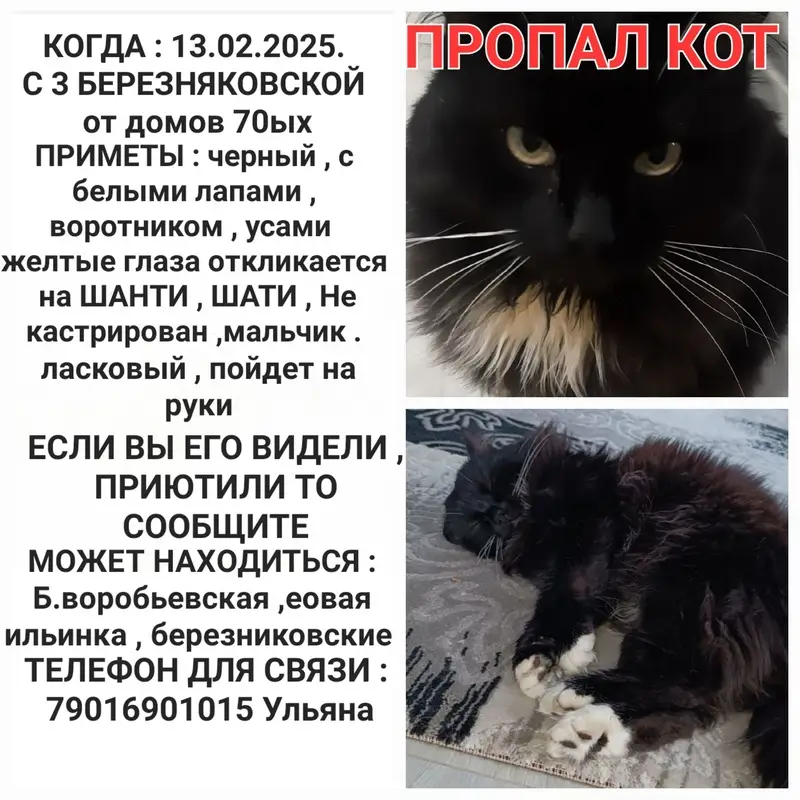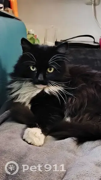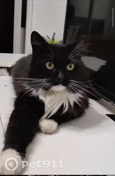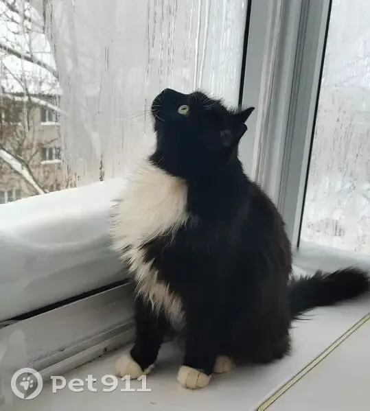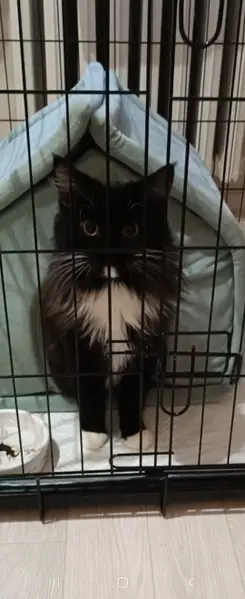 Ночью в подъезде была найдена кошка (или кот). Длинношёрстная черно белая, похожа на сибирскую.