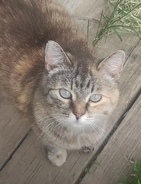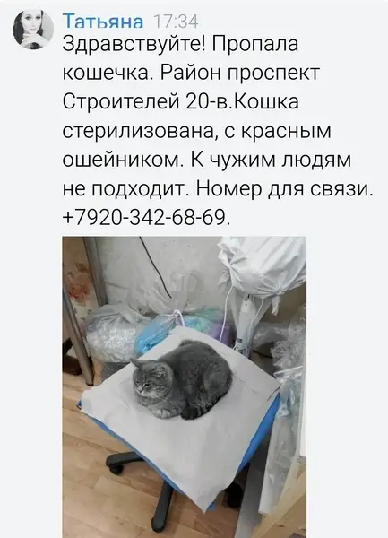Серая, с полосками, небольшого размера, мордочка чуть приплюснута. Похожа, что кошка, ласковая, спокойная, непугливая. Явно бывшедомовская. Прибилась в подъезд д51 красных зорь.(Район базы кенгуру ). Может найдется старый или новый хозяин.+7 964 493-04-19