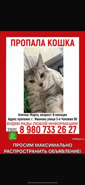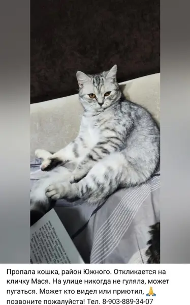 Породистый котик, вислоухий шотландец. Нашли в подъезде дома 22 по Любимова, соседи говорят, что котик жил уже 3 дня до нашей находки его. Котик чистый, ласковый. Есть предположения, что упал с балкона или окна, тк не дает гладить спинку и хвостик. На время взяли его к себе домой.