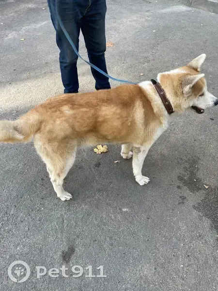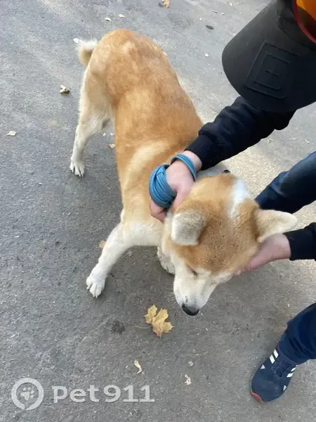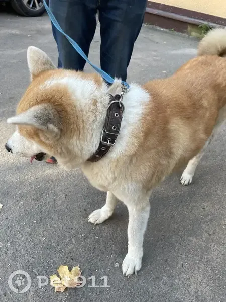 Акиту Ину, окрас рыжая с белым, небольшого роста, спокойная, ошейник коричневого цвета, на голове и холке белая полоска из шерсти. Перебегала дорогу и ее поймал мужчина который забрал ее к себе на передержку. Клеймо не смотрели.