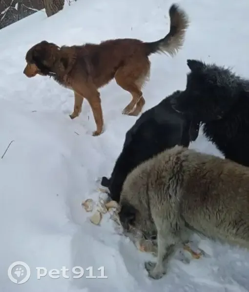 Первая собака черная, крупная, в кожаном коричневом ошейнике. Вторая собака рыжая, крупная, в широком тканевом ошейнике. Оба пса прибились к стае бездомных собак.