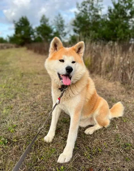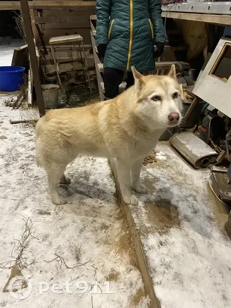 Хаски, рыжая, девочка, разные глаза (голубой и карий), есть противоблошинный ошейник, собака скорее всего испугалась петард и прибежала к нам, искала еду Собака очень дружелюбная и ласковая, сразу пошла с нами на контакт, явно домашняя, ухоженная и чистая Сразу попыталась забежать к нам в дом
