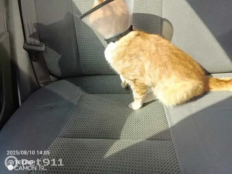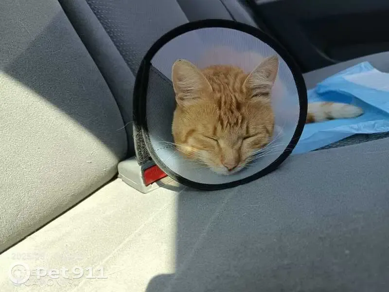 Окрас рыжий, задние лапки наполовину белые, а на передних белые тапочки, грудка белая. Особая примета был в пластиковом воротнике, но мог уже снять. Напугался, вырвался из рук и убежал в заросли кустарников.